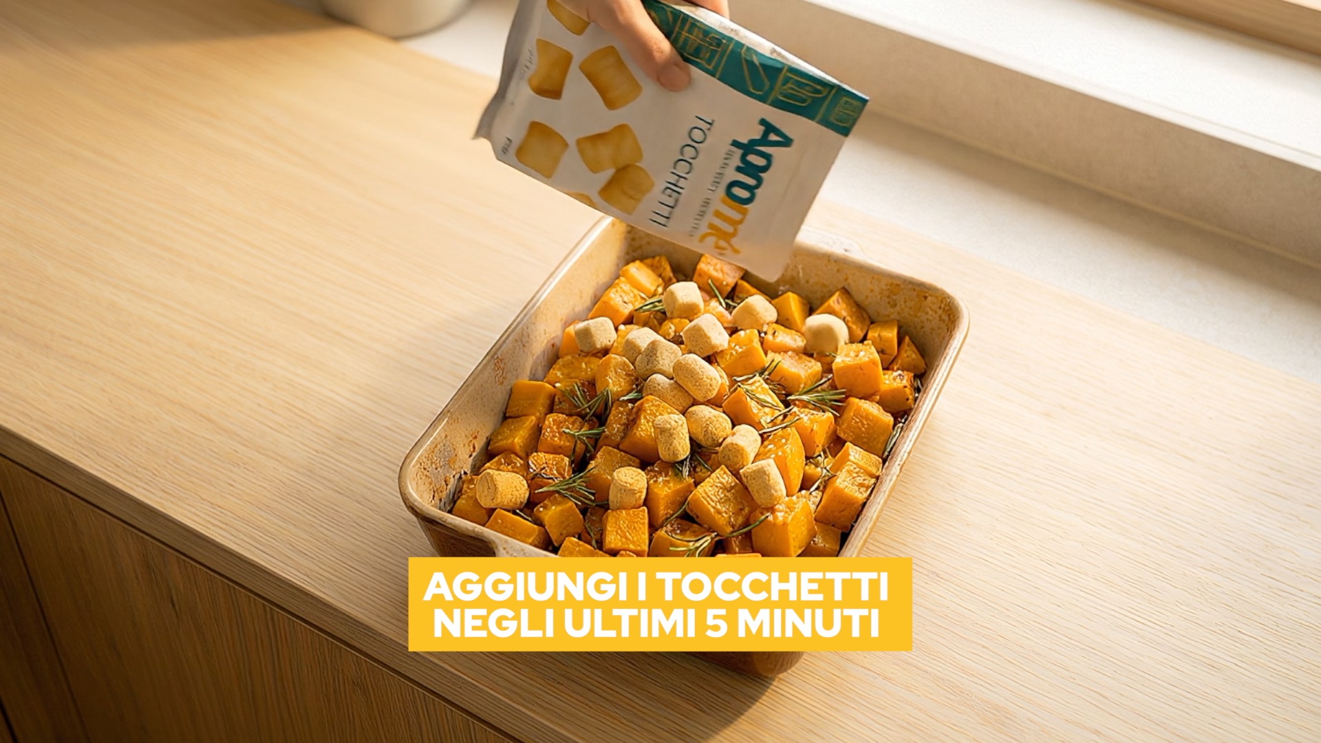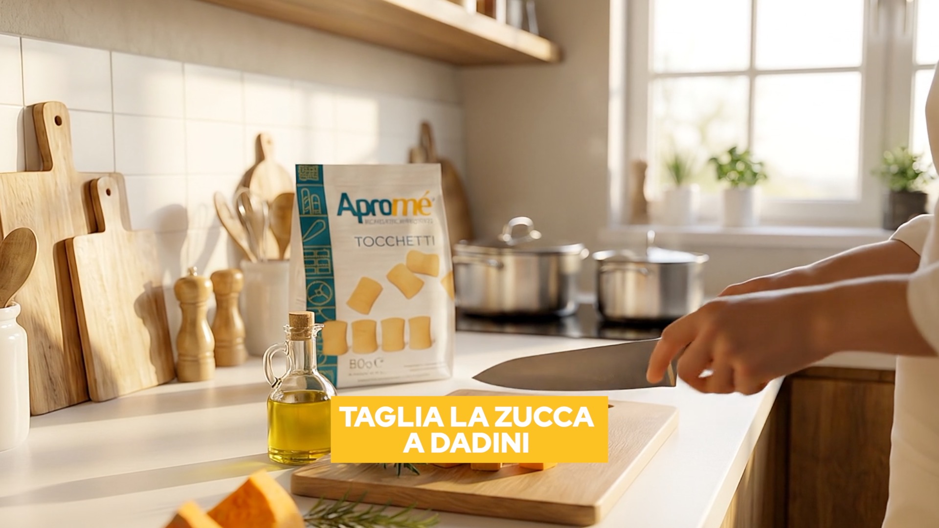 Un piatto caldo e profumato che unisce la dolcezza della zucca al carattere aromatico del rosmarino. I Tocchetti Apromé aggiungono una nota croccante, rendendo la preparazione semplice, gustosa e perfetta per i mesi più freddi.